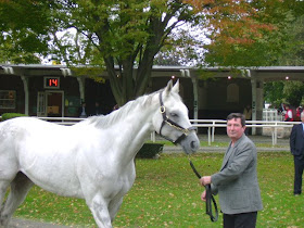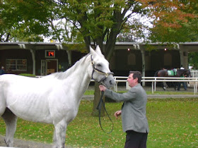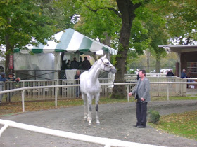 Breeders cup day at Belmont started out okay weather wise but by the 5th race the winds must have kicked up to 50 kts. Trees were swaying violently, flexing there branches to their limits. It was cold, windy and it was raining vertically. It would have been a horrible day to sit in that grandstand and a unfortunate day to hold a breeders Cup meet. The only race I watched from my usual perch in the grandstand was my Formal Degree's romp in the Knickerbocker. I quickly ran for cover to my indoor seat.